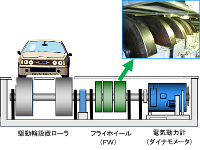 この原理から、慣性量の設定が無段階で行えるだけでなく、シャシダイナモ設備の固定慣性量より軽い車の場合でも、マイナス慣性を与えて試験できます。また構造上、右図のようにコンパクトな設備になるので、省スペースになります。